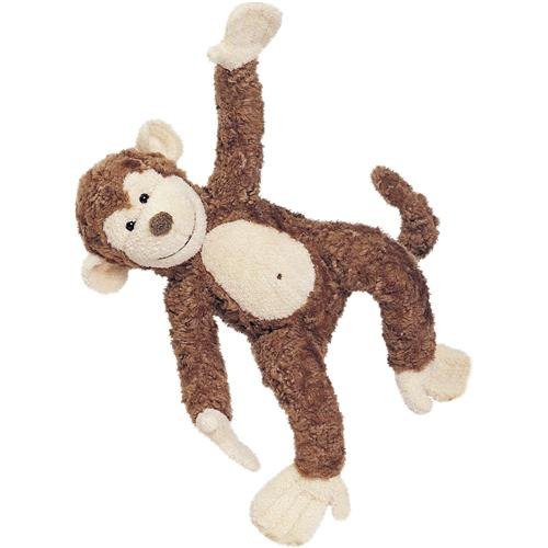 Hush little baby don't say a word... Mo the plush musical monkey by Douglas is a perfect toy for any young child. Standing 15 inches tall, this stuffed chocolate brown Kohair monkey is adorable and has a tan face, ears, hands, feet, and belly. A stitched mouth and belly button add detail and a fuzzy nose and dark, bead eyes add life. When his spiral tail is pulled, he plays "Hush Little Baby." Surface washable; for birth and up.
